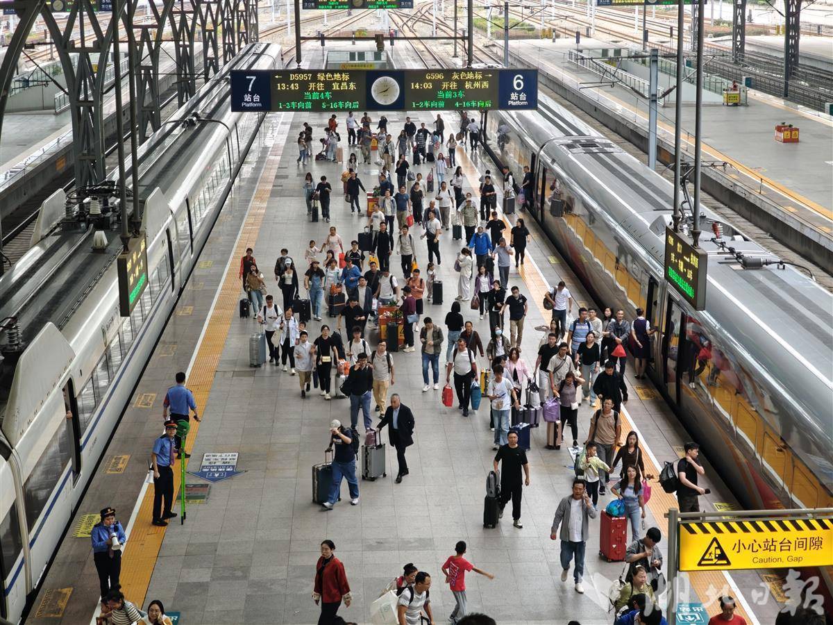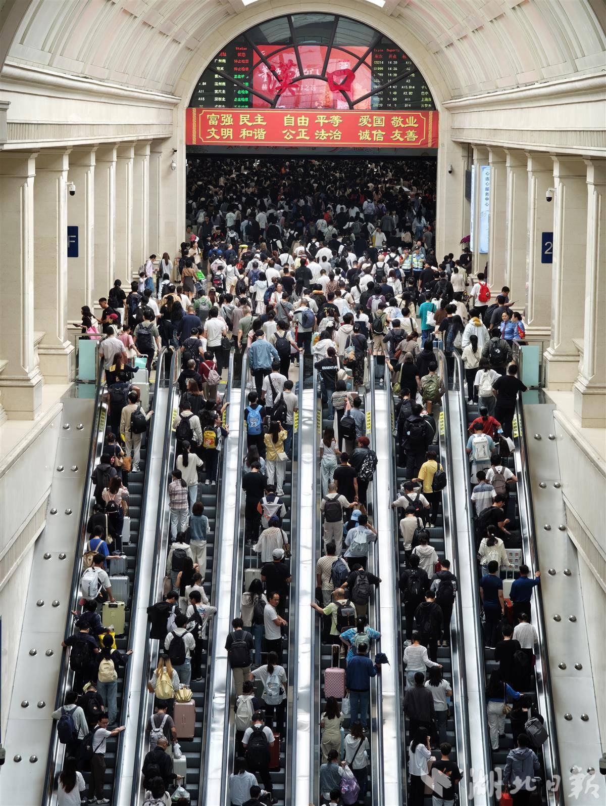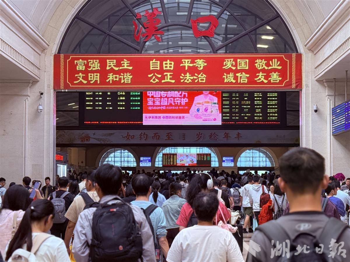 湖北日报讯(记者胡祎、通讯员邱晟)9月30日14时30分,汉口火车站到达客流和出发客流同步迎来高峰。候车大厅高峰小时发送旅客突破2万余人次。